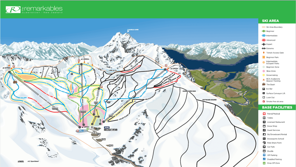 Remarks is located on the South Island of New Zealand, in the Otago Region. It is easily accessible from Queenstown via an access road which is sealed for 3/4 of the way up (9km sealed road and 4km unsealed road). For the uninitiated, New Zealand ski field access roads can be rather daunting consisting of narrow roads bordering vertical drop-offs, and steep, switchback corners. If you’re not a confident driver, consider the bus transport options listed below. And if you are driving, The Remarkables encourages carpooling – you’ll need 3 or more to park at the very top (otherwise you’ll be directed to car park 4 and provided with a free shuttle to the base building).