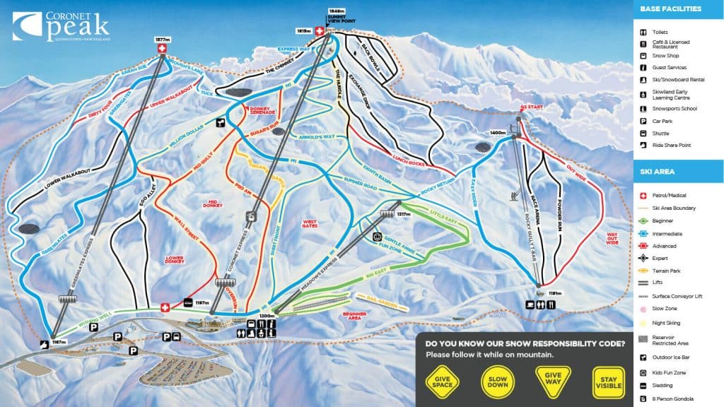 If the snow has been a bit light in the Queenstown area, you’ll be happy to know that Coronet Peak has excellent snow cannon coverage, probably the best of all the New Zealand ski resorts. Man-made snow is not as good as natural powder but it’s a whole lot better than riding on ice or rocks!